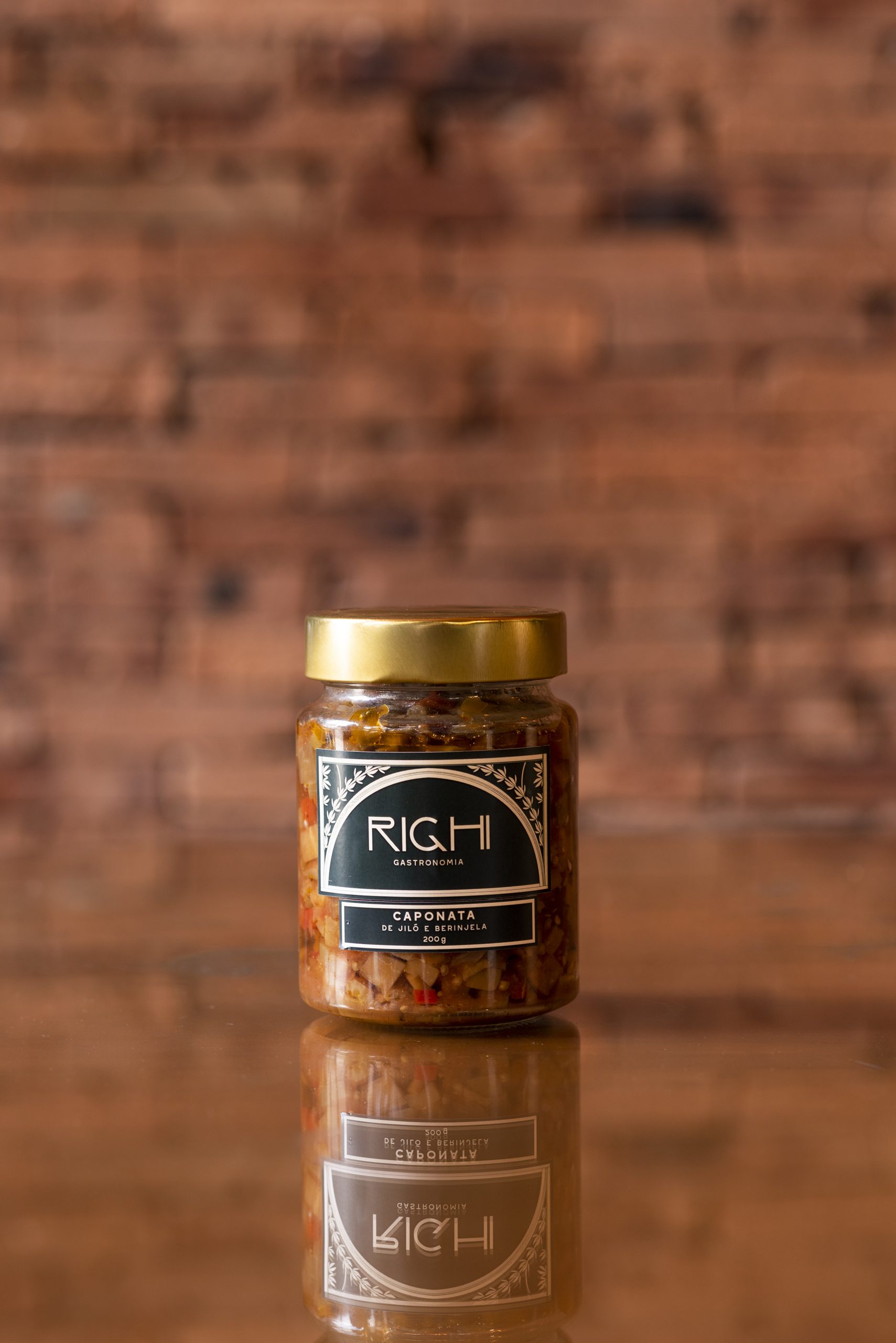 Nossa Caponata de Jiló e Berinjela é uma mistura do ácido e doce, feito com uma seleção de pimentões, berinjelas, e jiló, que plantamos em nossa fazenda, cebola roxa, azeite de oliva extra virgem italiano, alho, pimenta do reino, e uma mistura de vinagre, açúcar e sal.